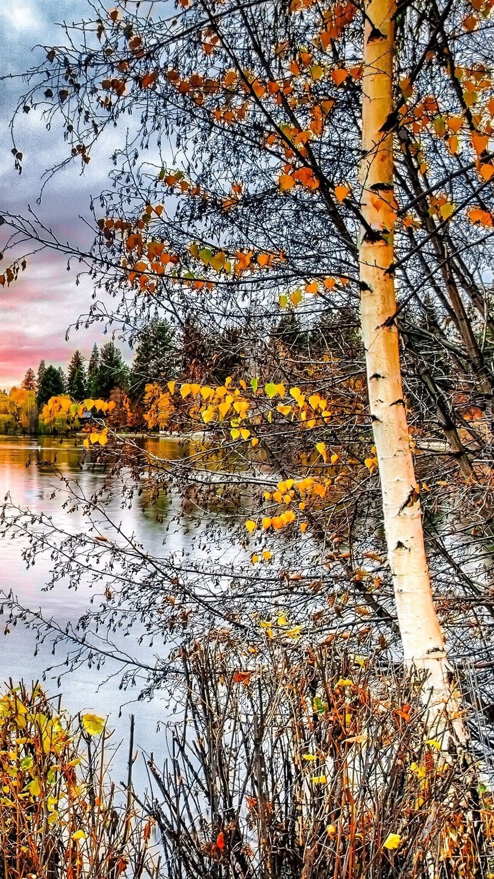 Edytor tapety: Brzoza nad jeziorem jesienną porą