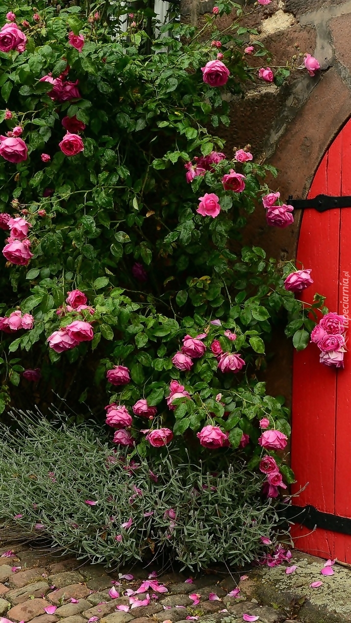Edytor tapety: Różowe róże obok czerwonej bramy