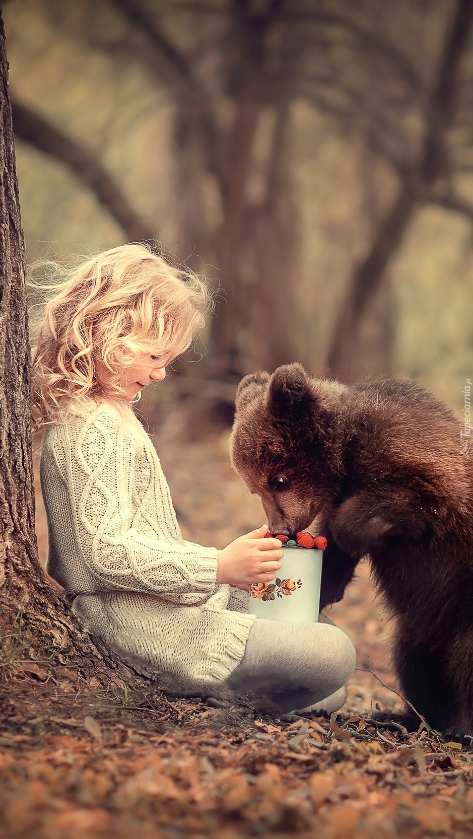 Edytor tapety: Dziewczynka z niedźwiadkiem pałaszującym leśne owoce