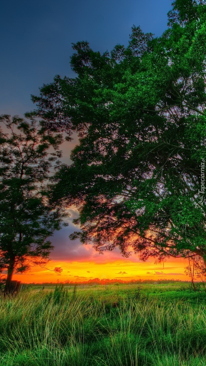 Edytor tapety: Łąka z drzewami o zachodzie słońca