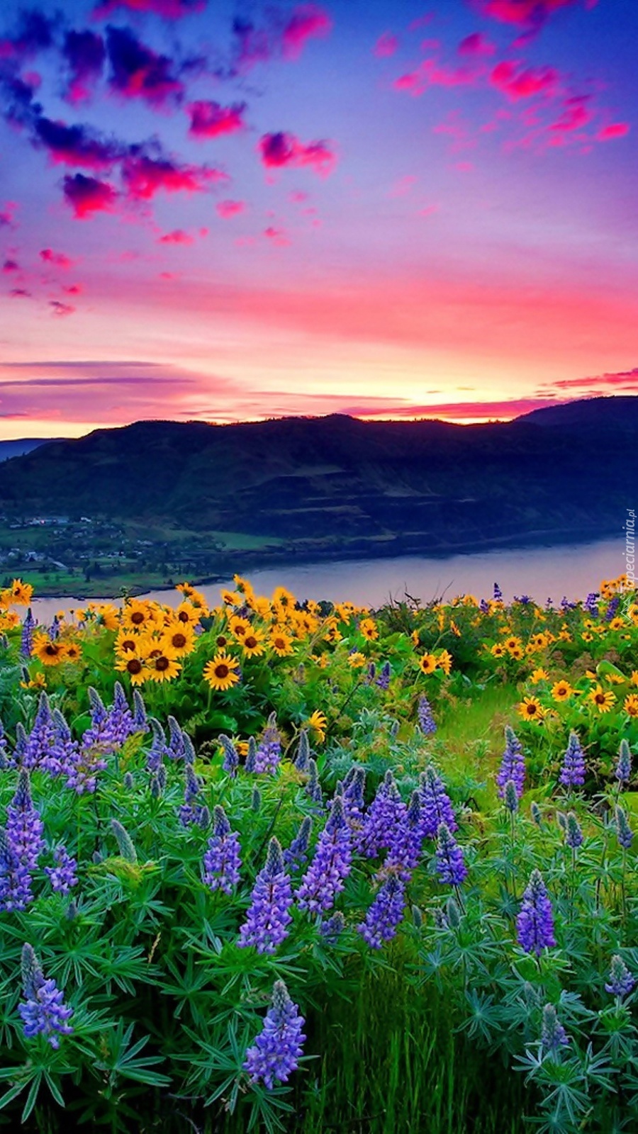 Edytor tapety: Jezioro w górach przy kwiatowej łące