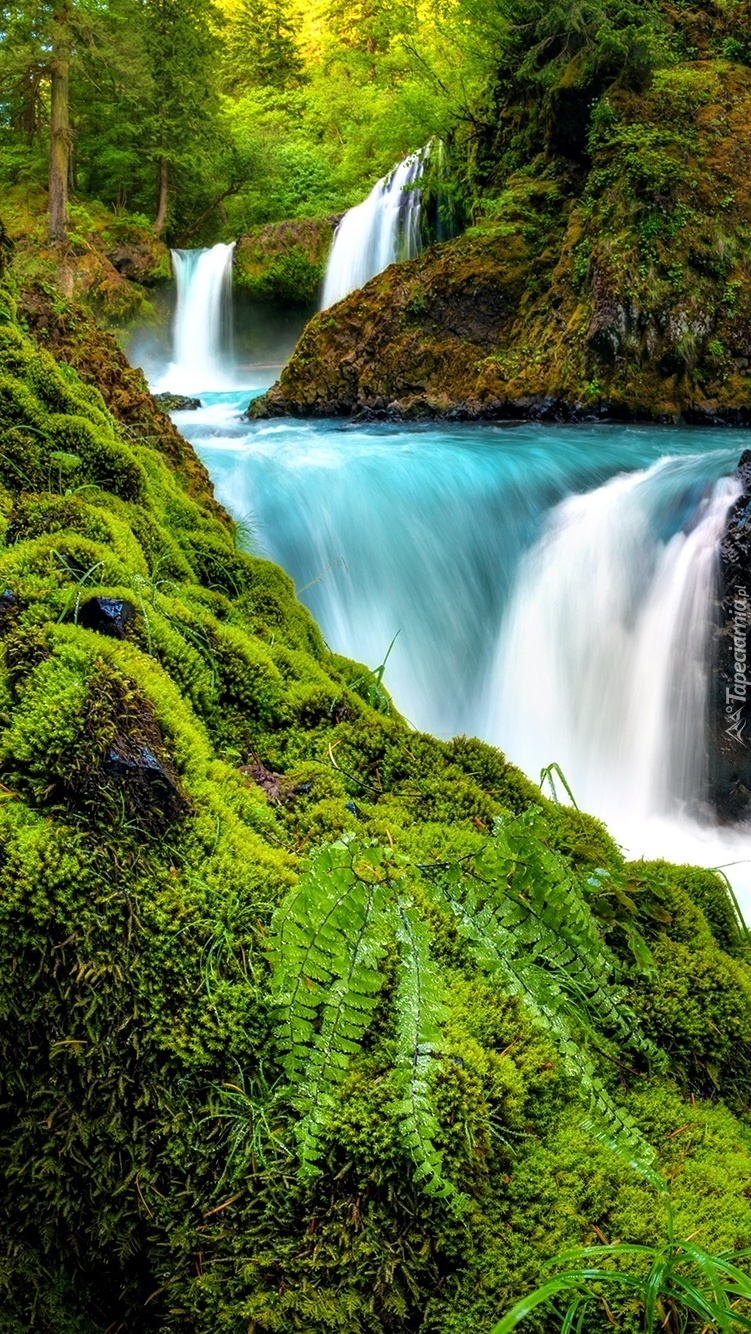 Edytor tapety: Wodospad wśród omszałych skał