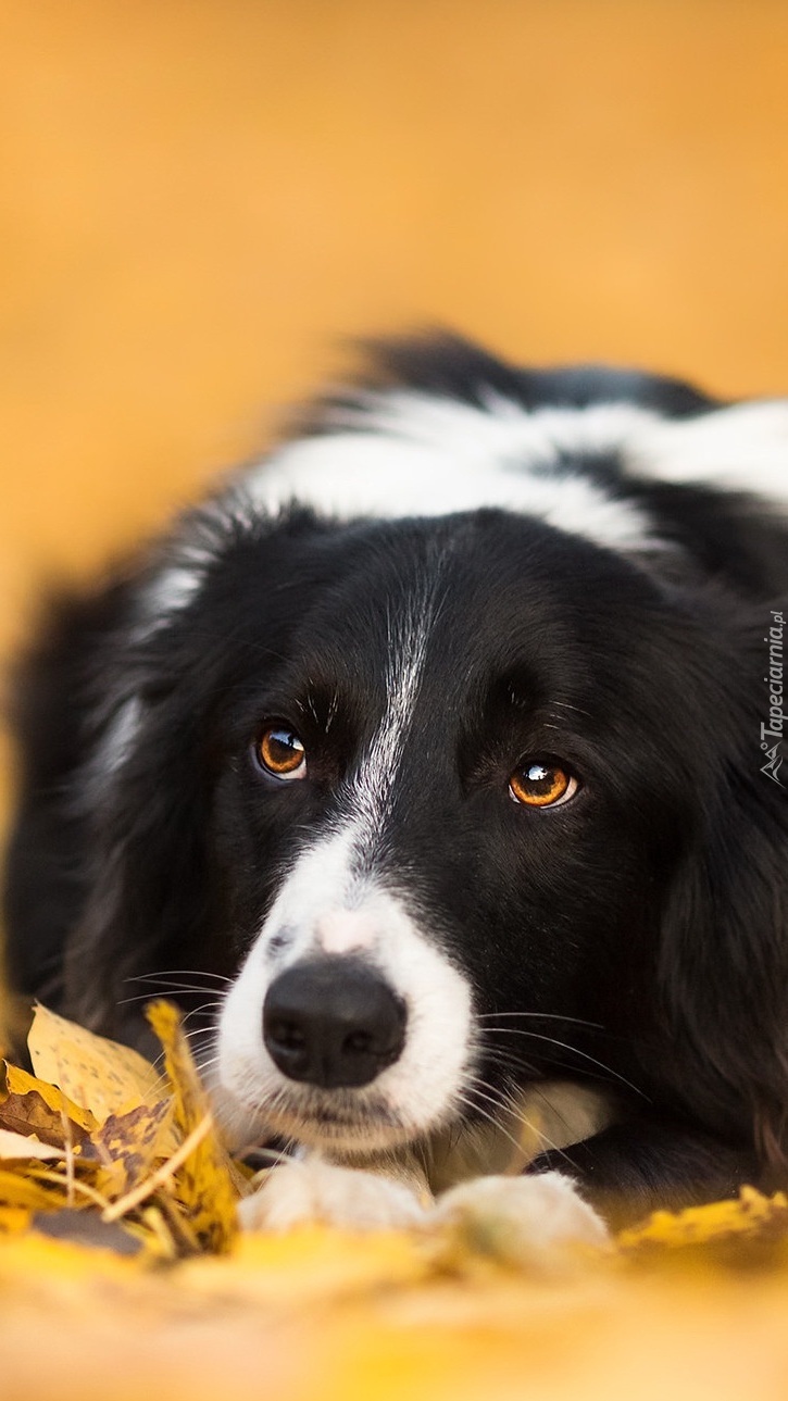 Edytor tapety: Leżący border collie w jesiennych liściach