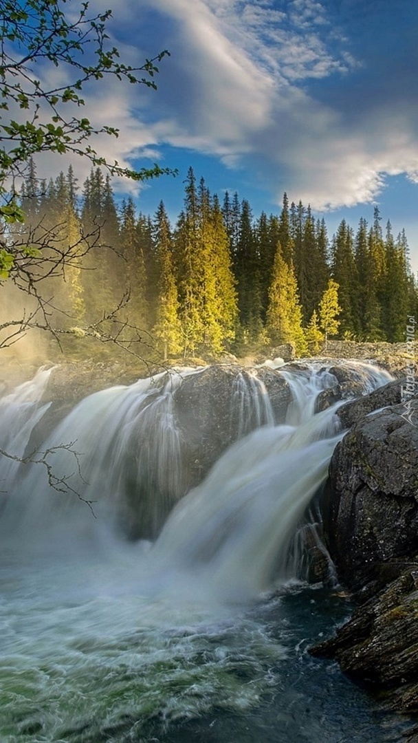 Edytor tapety: Rzeka z wodospadem o wschodzie słońca