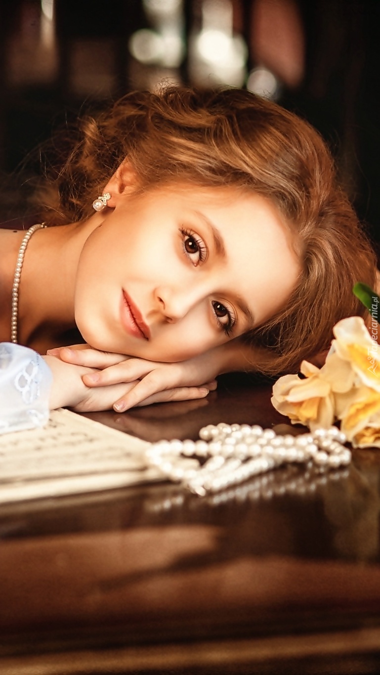 Edytor tapety: Zamyślona dziewczyna oparta o fortepian