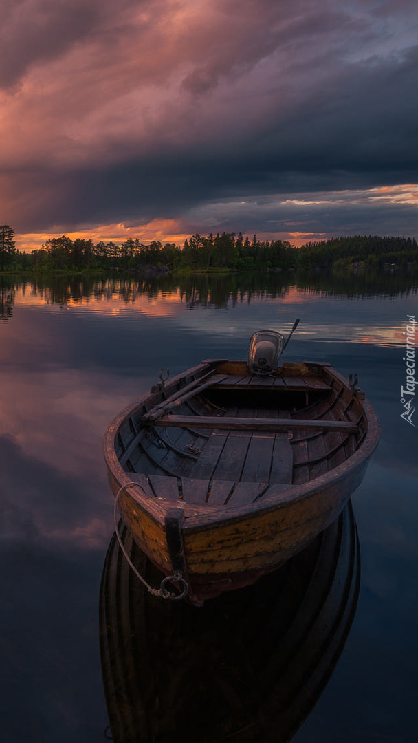 Edytor tapety: Łódka na jeziorze o zachodzie słońca