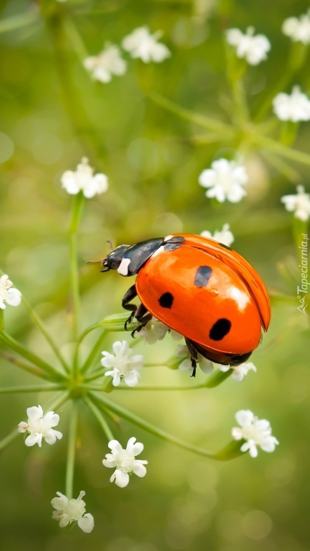 Edytor tapety: Biedronka spacerująca po białych kwiatkach
