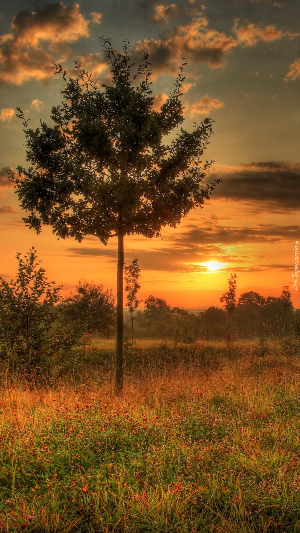 Edytor tapety: Łąka z drzewkami o zachodzie słońca