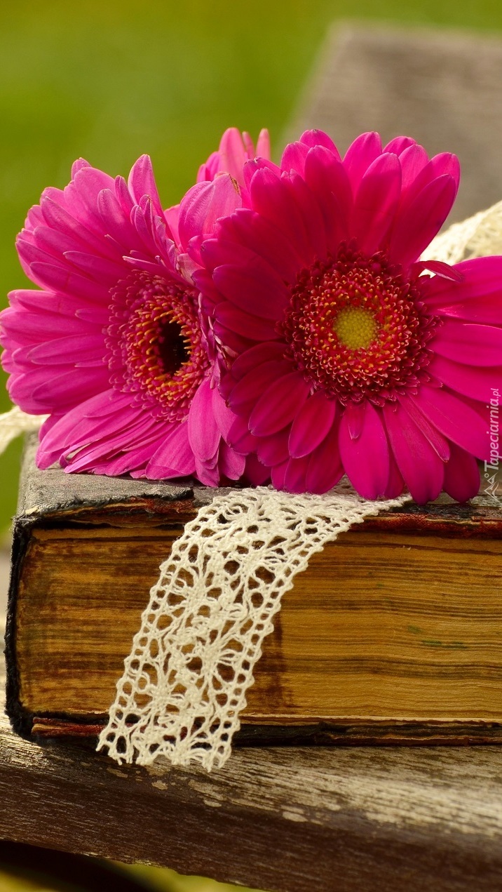 Edytor tapety: Różowe gerbery na książce