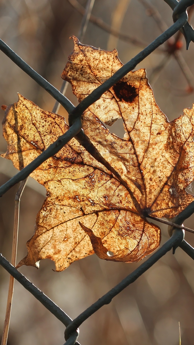 Edytor tapety: Suchy jesienny liść na ogrodzeniu