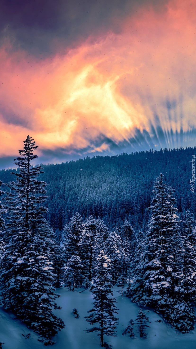 Edytor tapety: Zimowy las świerkowy o zachodzie słońca