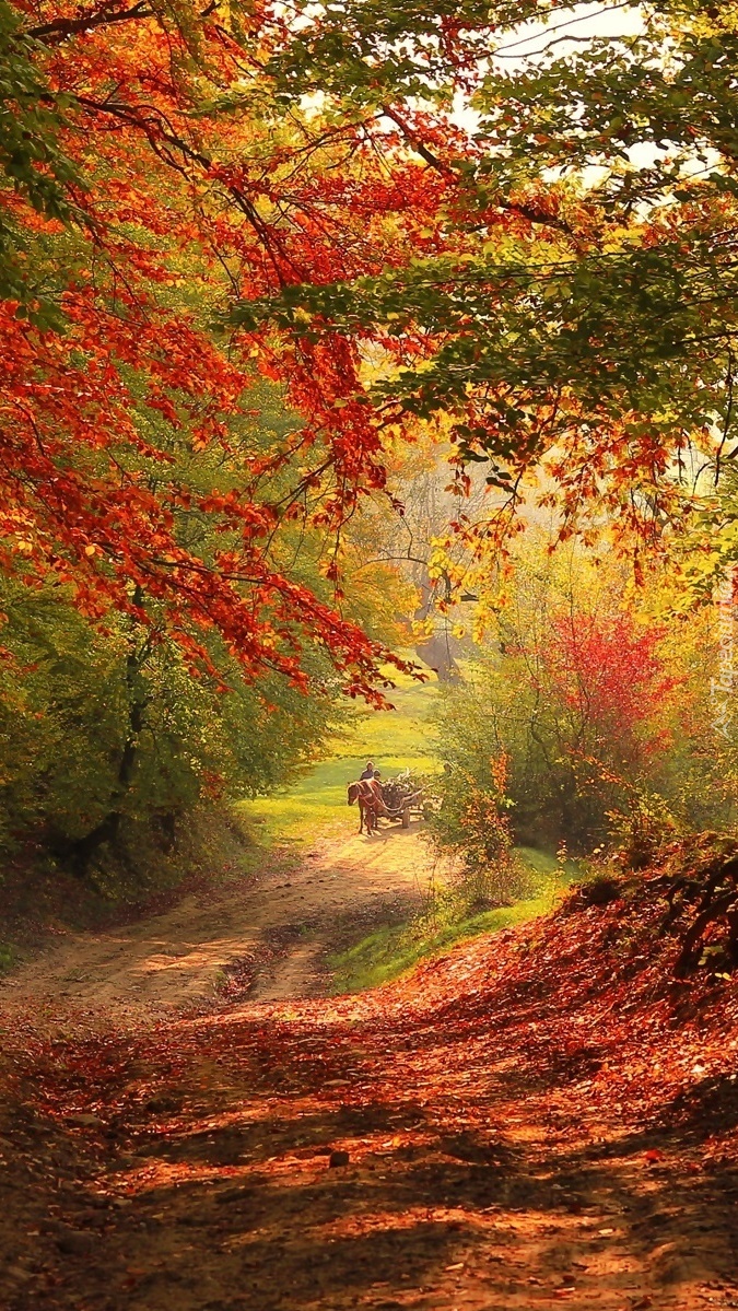 Edytor tapety: Chłopski wóz na leśnej jesiennej drodze