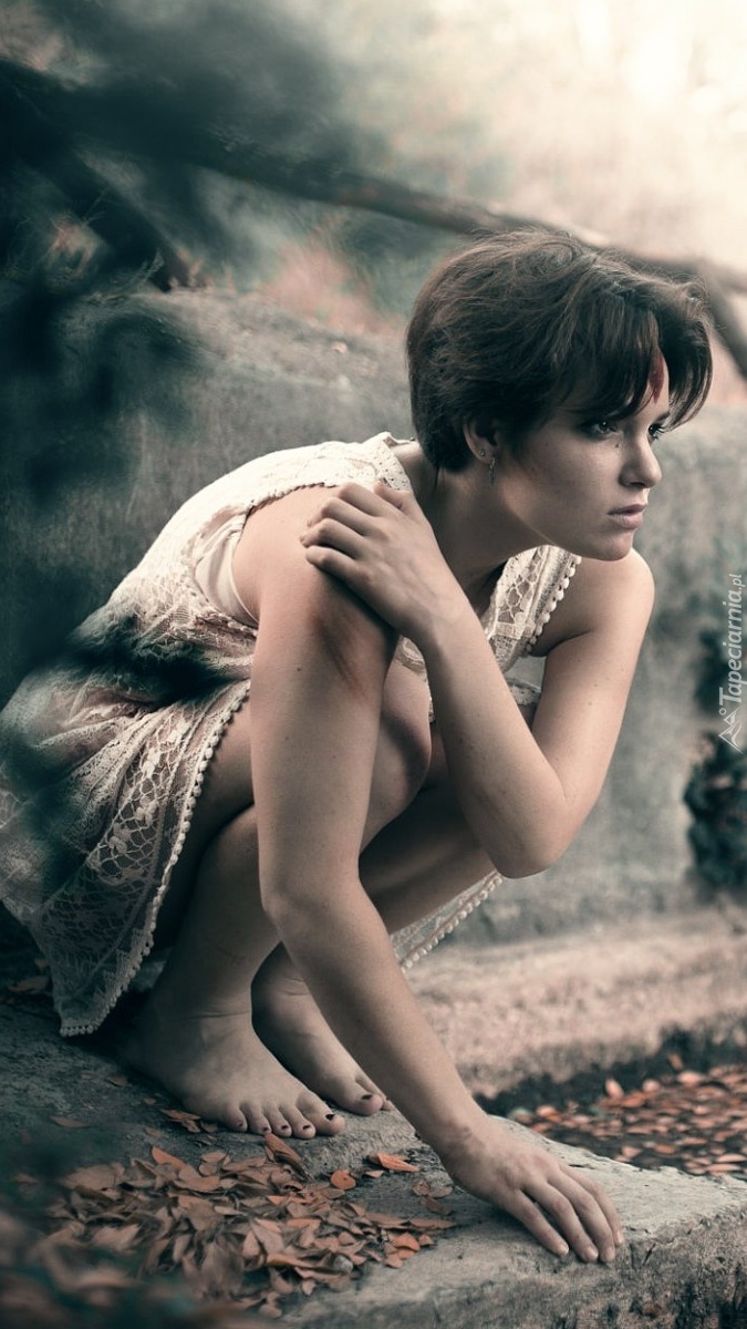 Edytor tapety: Brunetka bez butów obok płotu