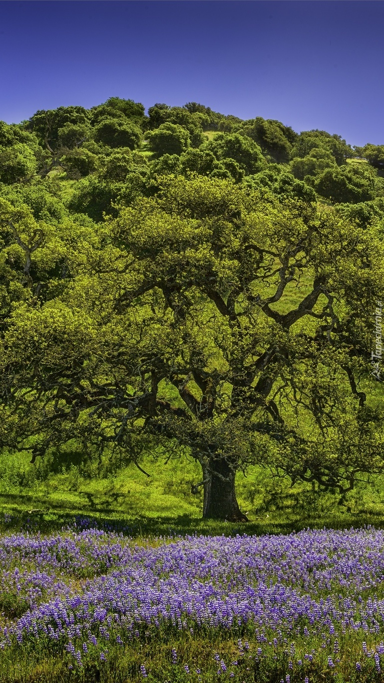 Edytor tapety: Drzewo na łące porośniętej łubinem