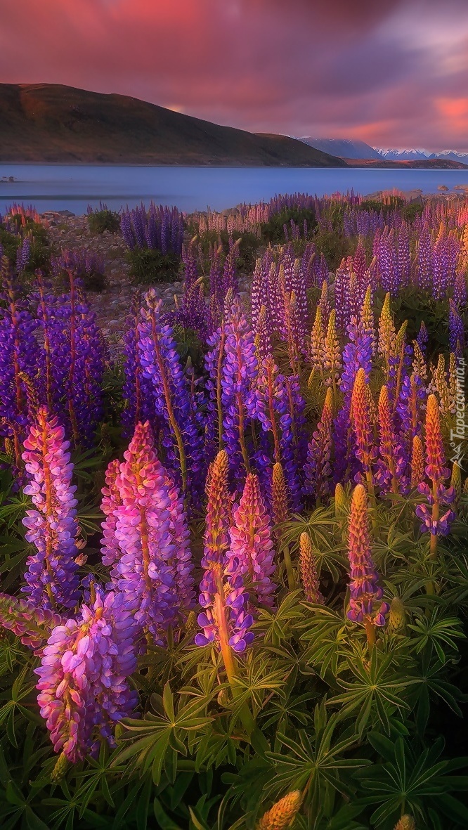 Edytor tapety: Łubinowa łąka nad jeziorem