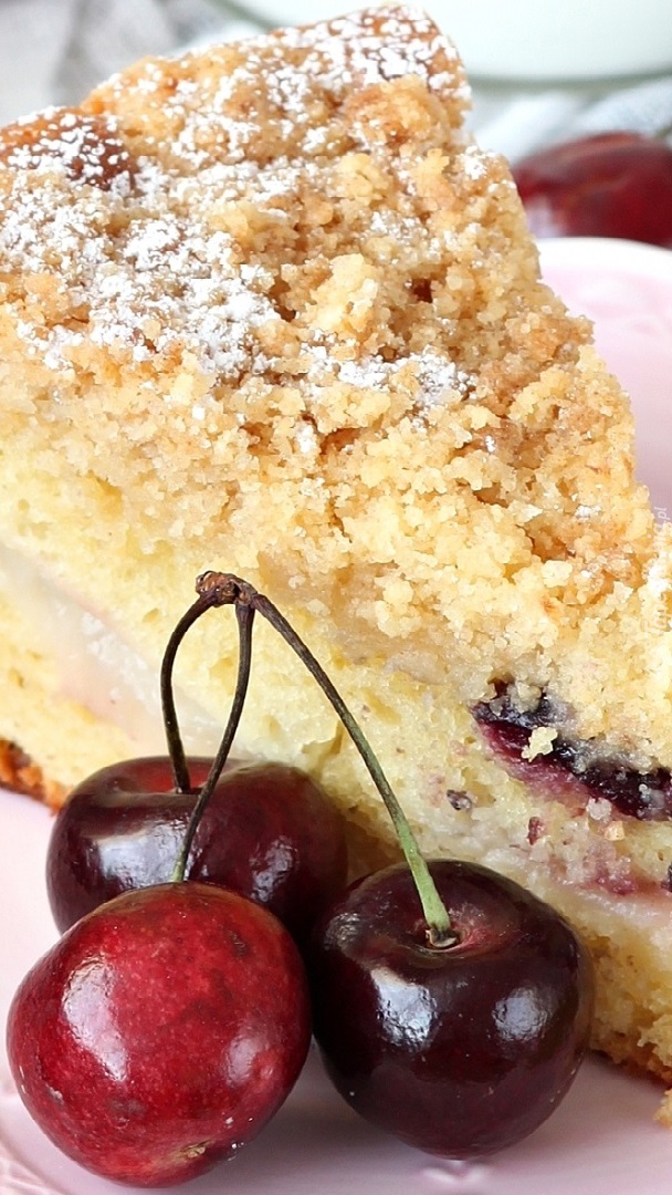 Edytor tapety: Kawałek ciasta z kruszonką i czereśnie