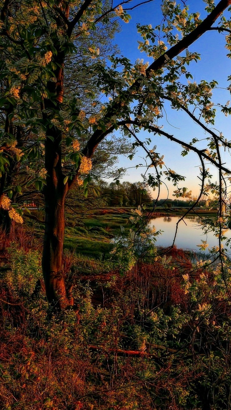 Edytor tapety: Kwitnące drzewo nad stawem