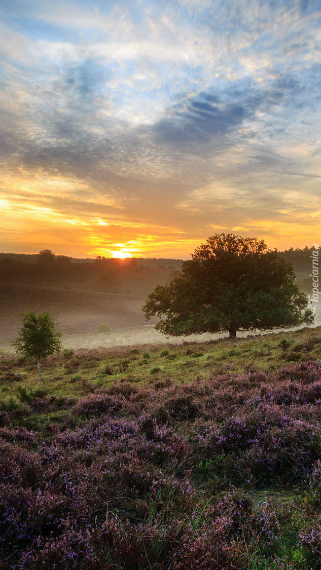 Edytor tapety: Drzewa na wrzosowisku we mgle