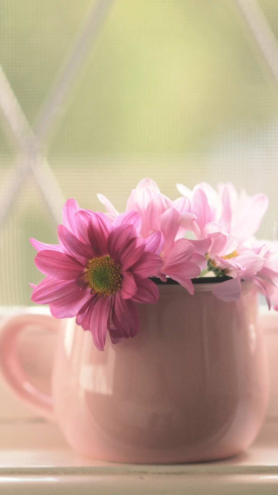 Edytor tapety: Różowe kwiatki w wazoniku na parapecie