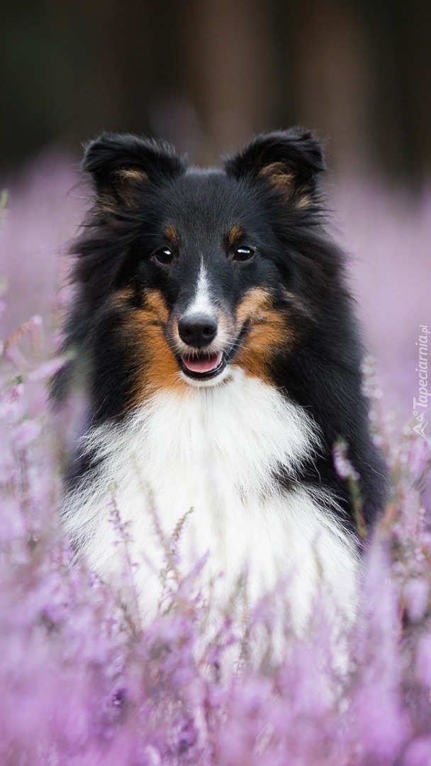 Edytor tapety: Owczarek szetlandzki we wrzosie