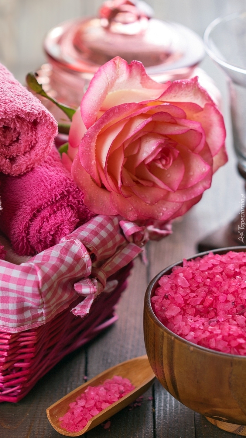 Edytor tapety: Sole kąpielowe obok róży i ręczników
