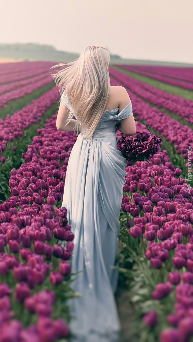 Edytor tapety: Spacer kobiety tulipanowym polem
