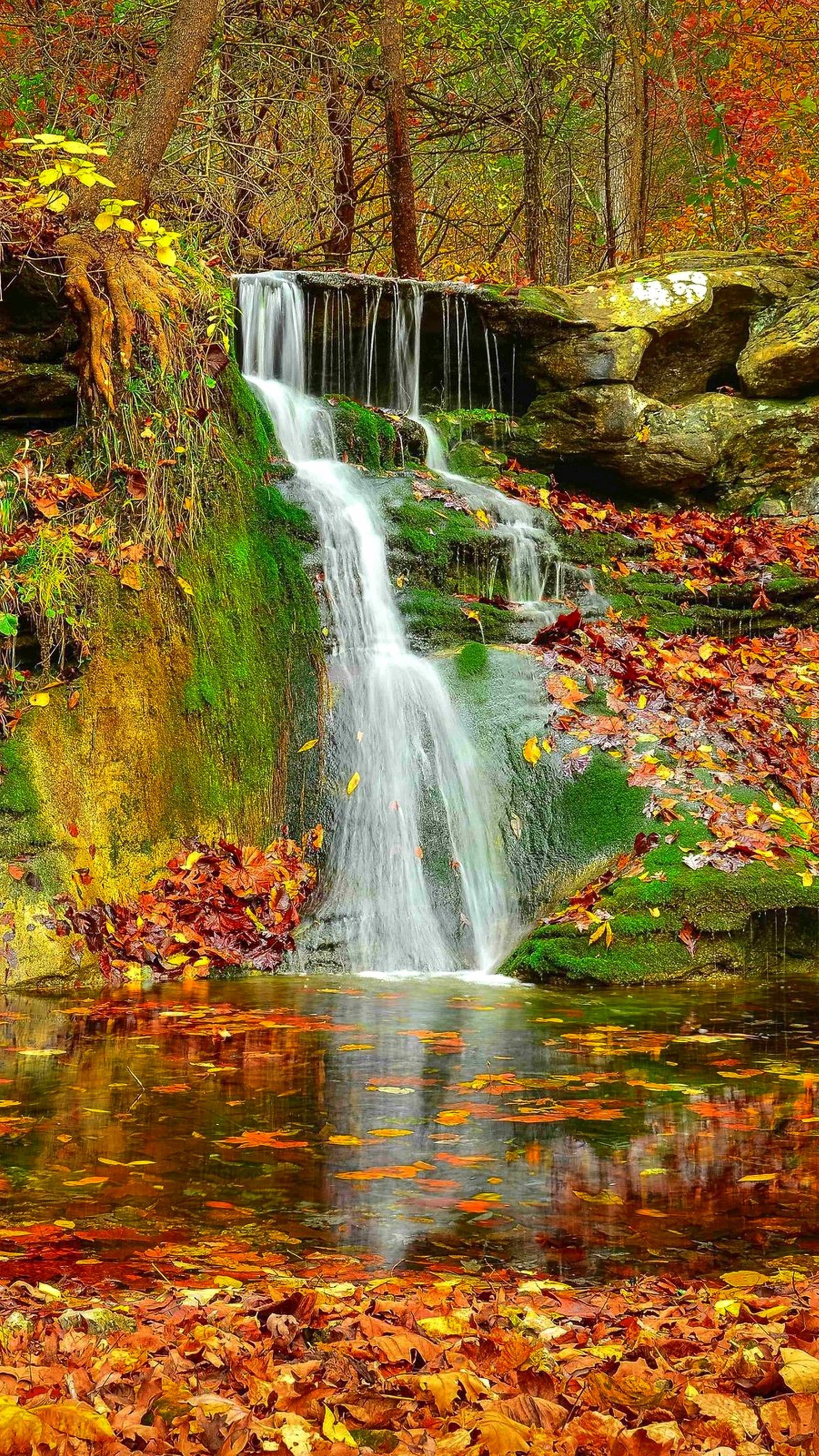 Edytor tapety: Skalny wodospad z jesiennymi liśćmi
