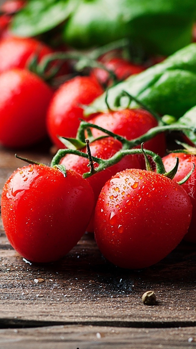 Edytor tapety: Pomidory koktajlowe z kropelkami wody