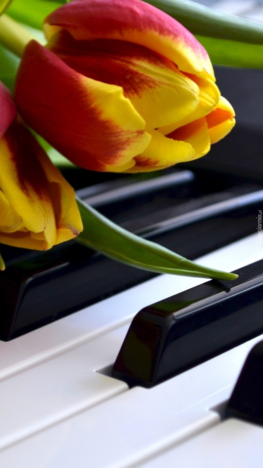 Edytor tapety: Żółto-czerwone tulipany na klawiszach pianina