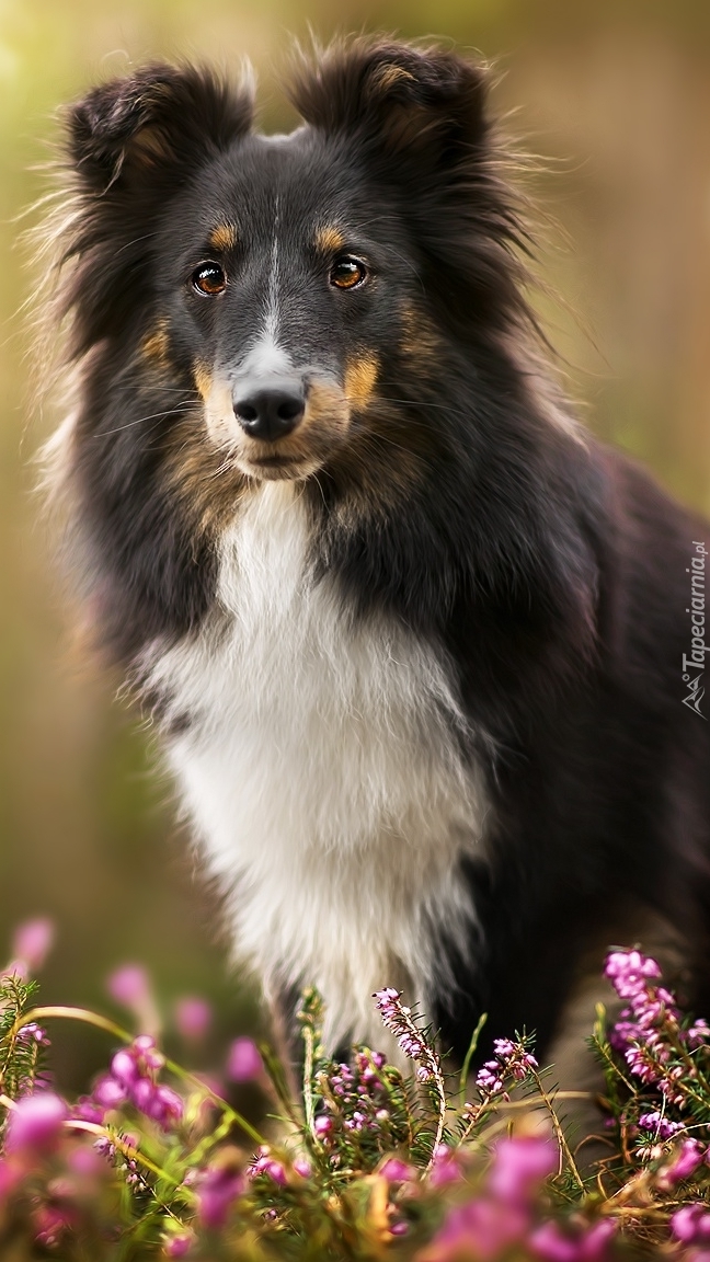 Edytor tapety: Owczarek szetlandzki we wrzosie