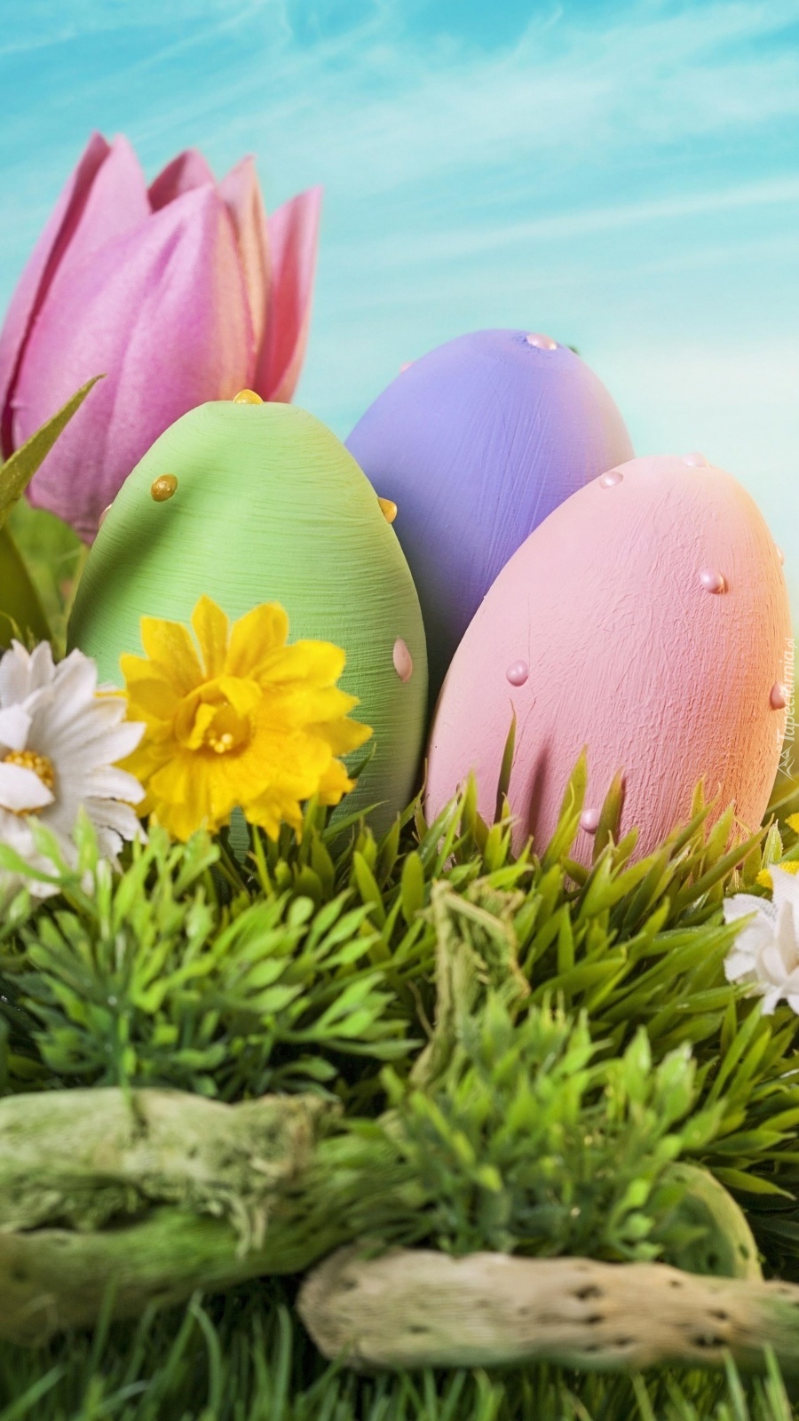 Edytor tapety: Kolorowe pisanki wśród kwiatów