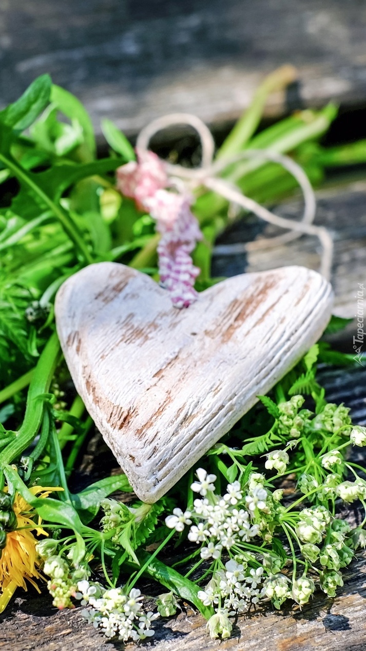 Edytor tapety: Drewniane serce na bukiecie polnych kwiatów
