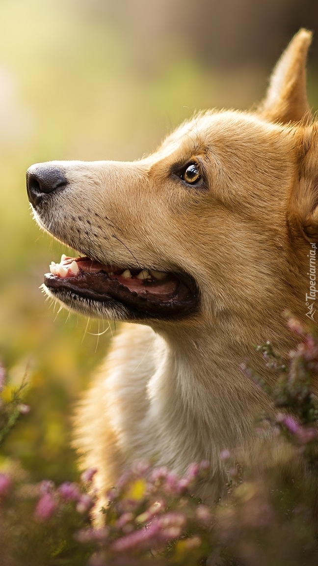 Edytor tapety: Zaciekawiony pies na wrzosowisku
