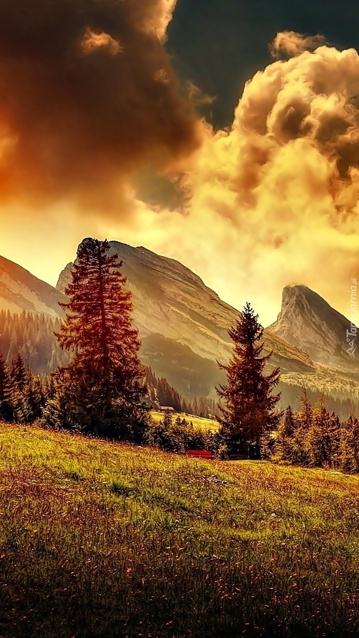 Edytor tapety: Zachód słońca nad górską polaną