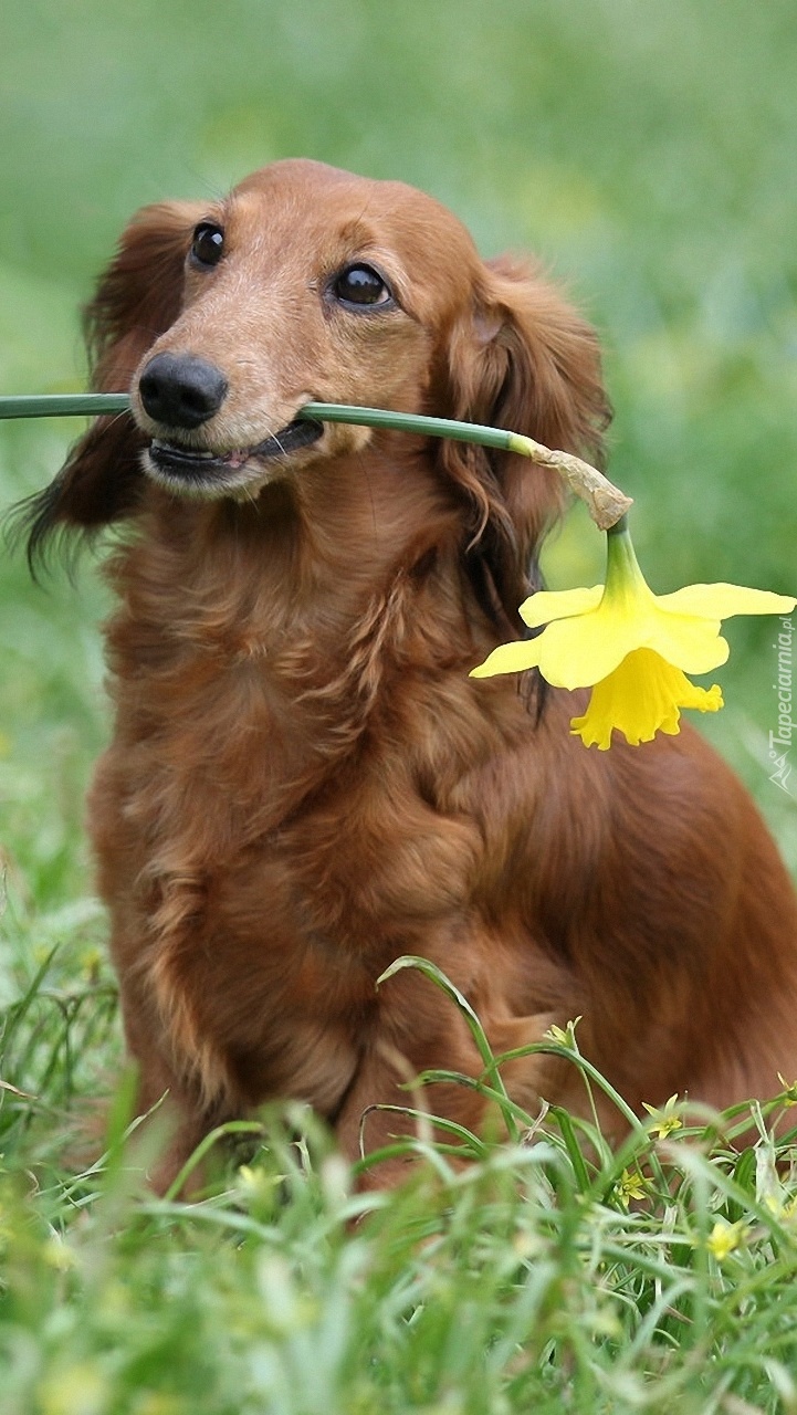 Edytor tapety: Jamnik długowłosy z żonkilem na łące