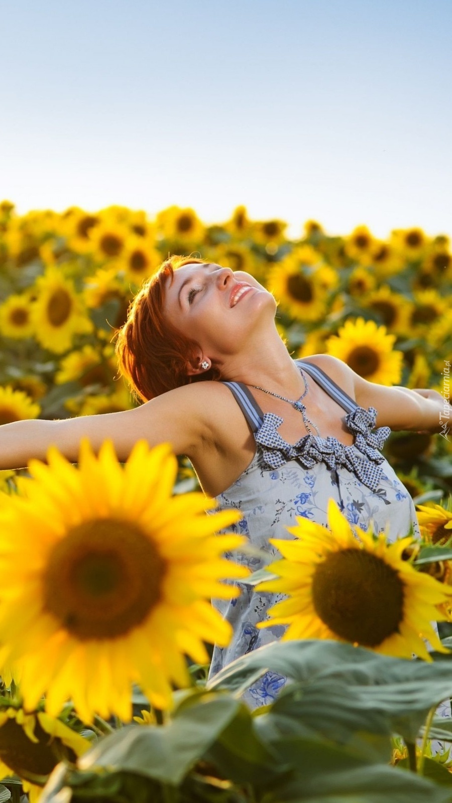 Edytor tapety: Radosna dziewczyna na polu słoneczników