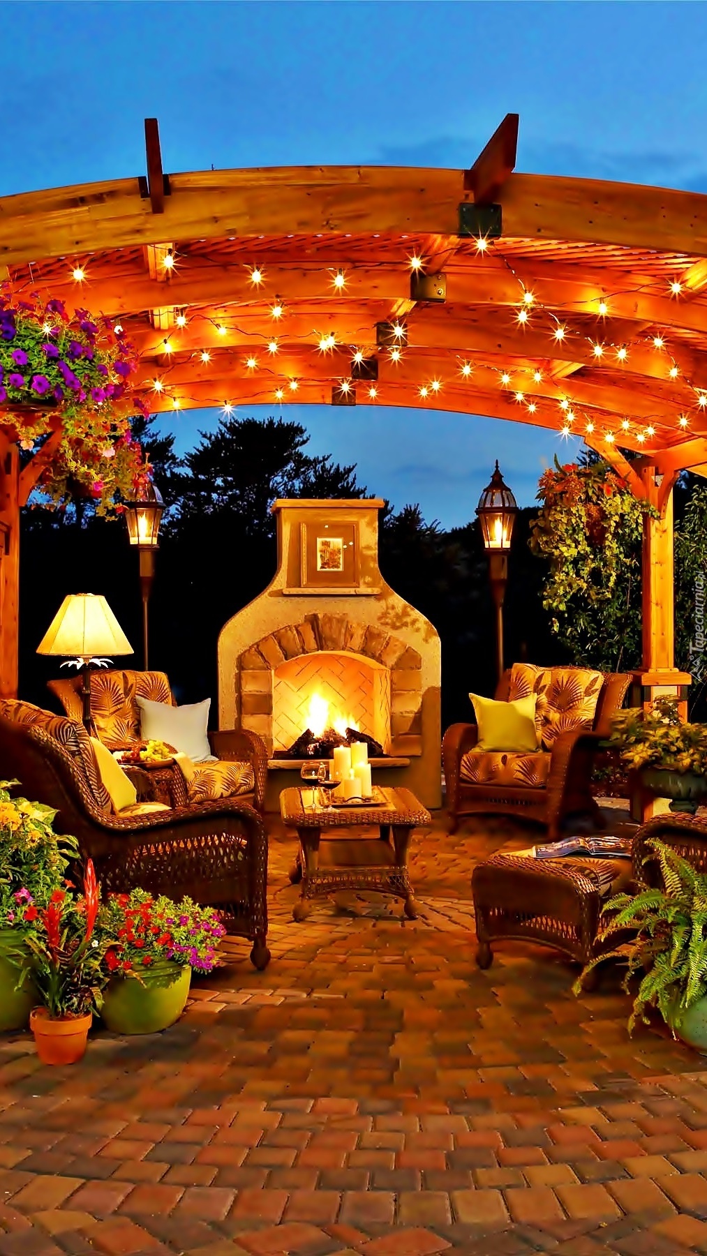 Edytor tapety: Odpoczynek w ogrodowej altanie przy kominku