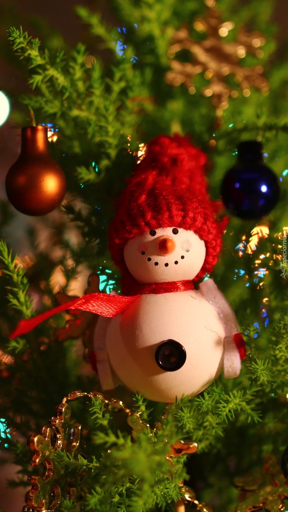 Edytor tapety: Kolorowy bałwanek powieszony na gałązce choinki