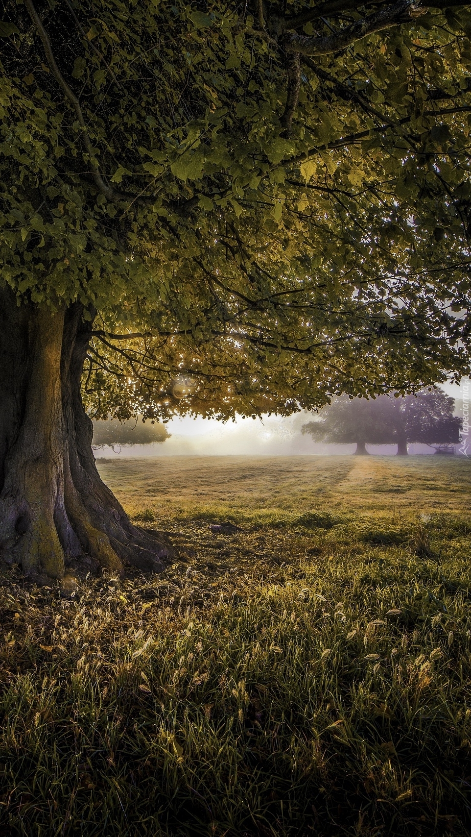 Edytor tapety: Stare drzewo na łące otulonej mgłą