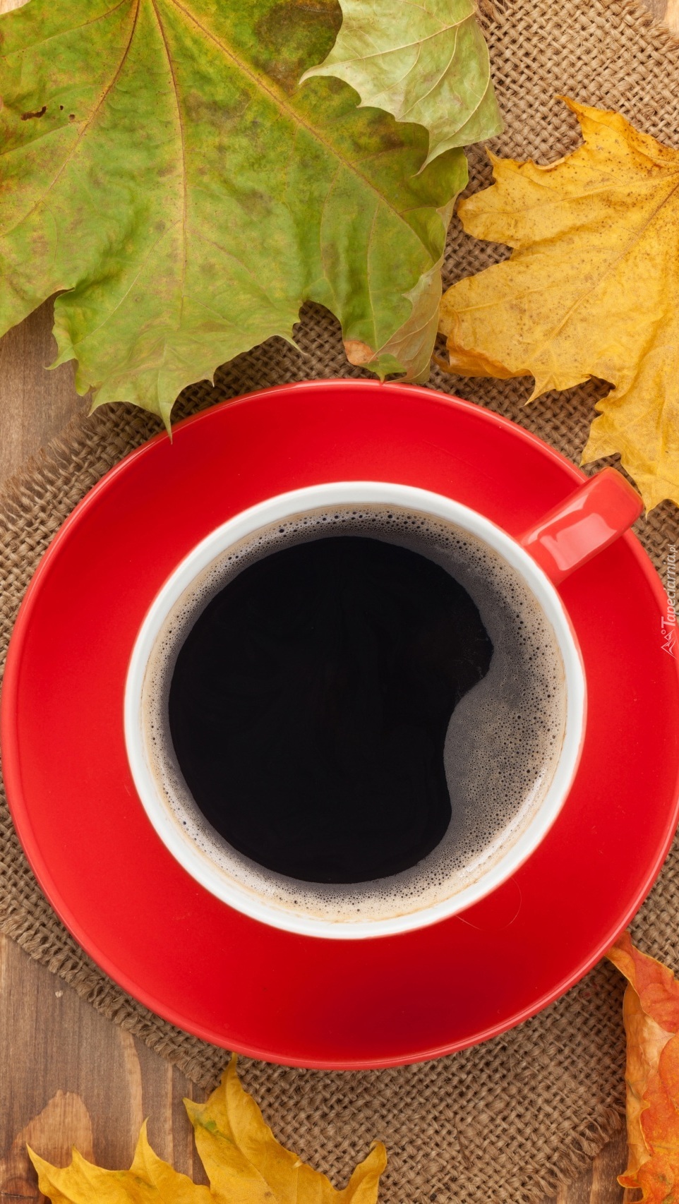 Edytor tapety: Kawa na serwetce wśród jesiennych liści