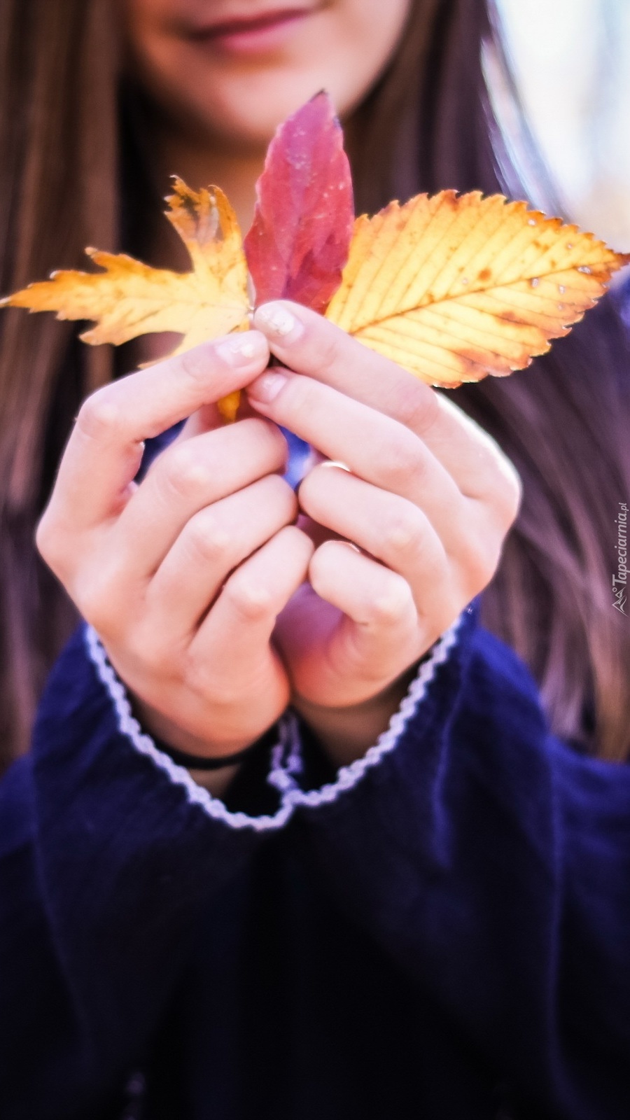 Edytor tapety: Dziewczynka trzymająca w ręku jesienne liście