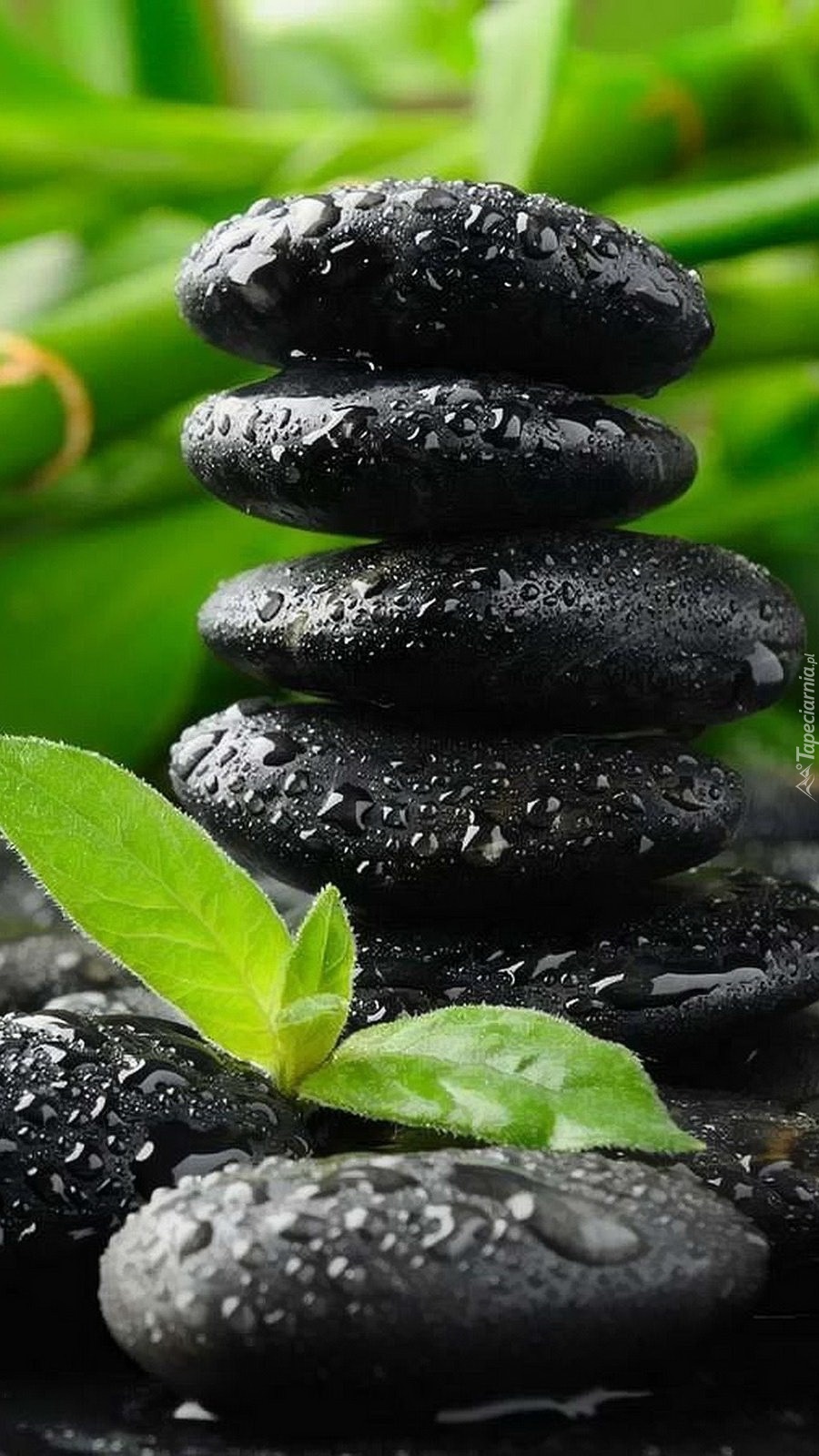 Edytor tapety: Mokre ciemne kamienie i pędy bambusa