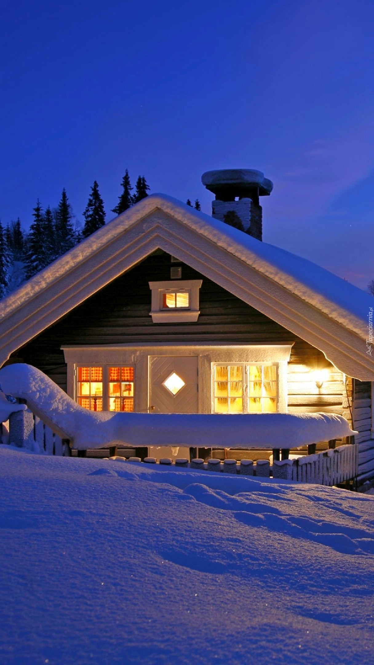 Edytor tapety: Oświetlony dom nocą zimową porą
