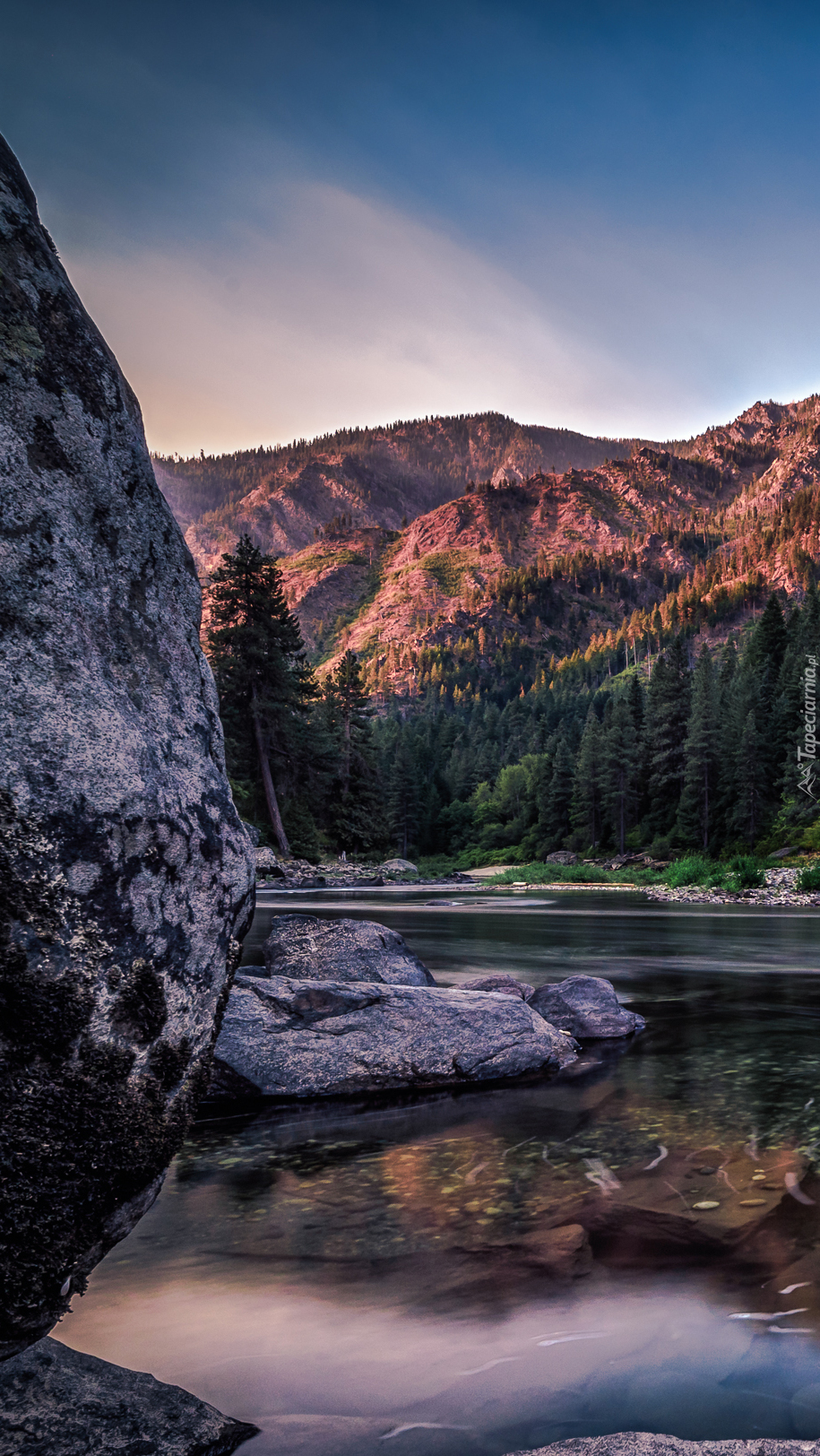 Edytor tapety: Głazy na brzegu rzeki w górach