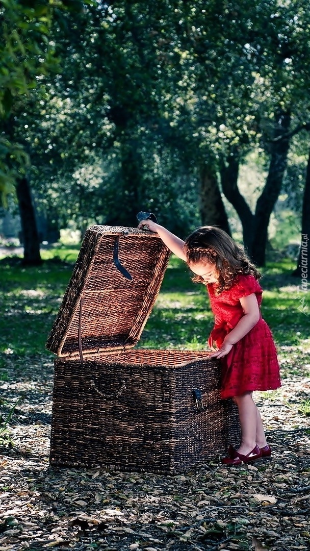 Edytor tapety: Dziewczynka przy otwartym kufrze w lesie