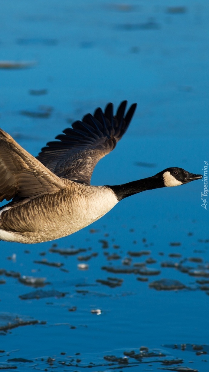 Edytor tapety: Dzika gęś lecąca nad jeziorem