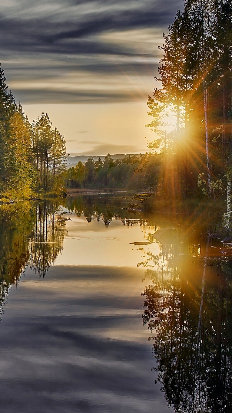 Edytor tapety: Jezioro w blasku jesiennego wschodzącego słońca
