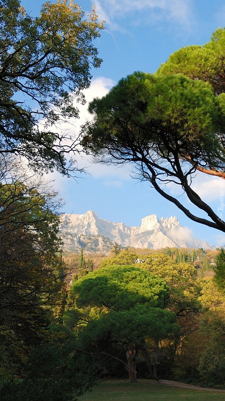 Edytor tapety: Park z widokiem na górskie szczyty