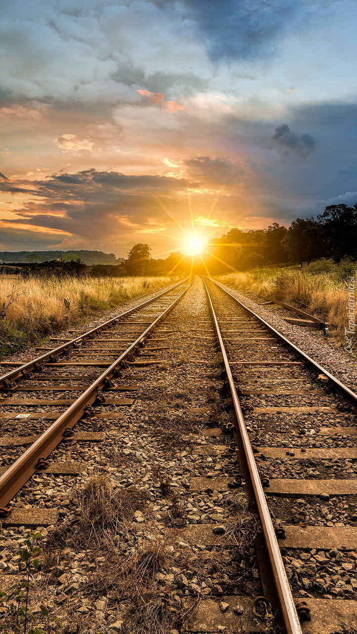 Edytor tapety: Tory kolejowe o zachodzie słońca