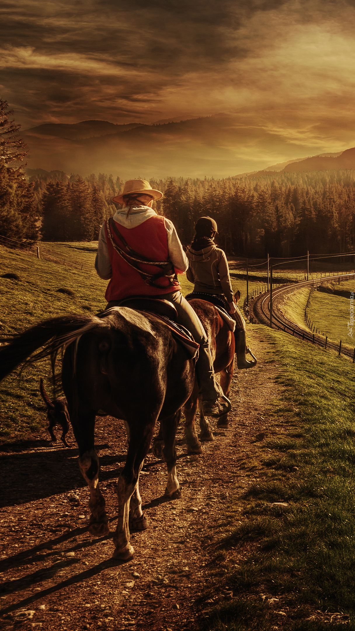Edytor tapety: Jeźdźcy na polnej drodze w górach